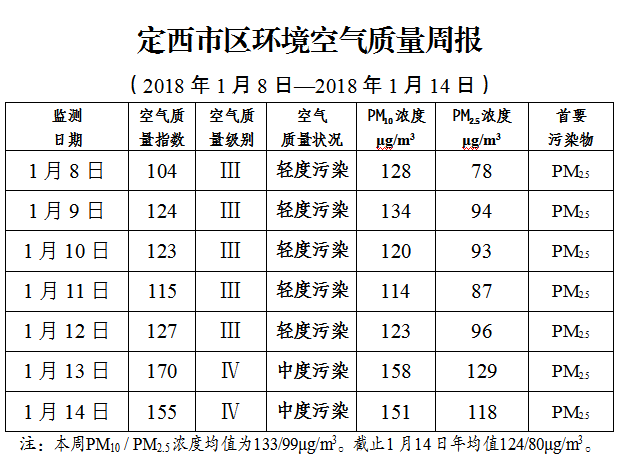 定西市区环境空气质量周报 (2018年1月8日—2018年1月14日)