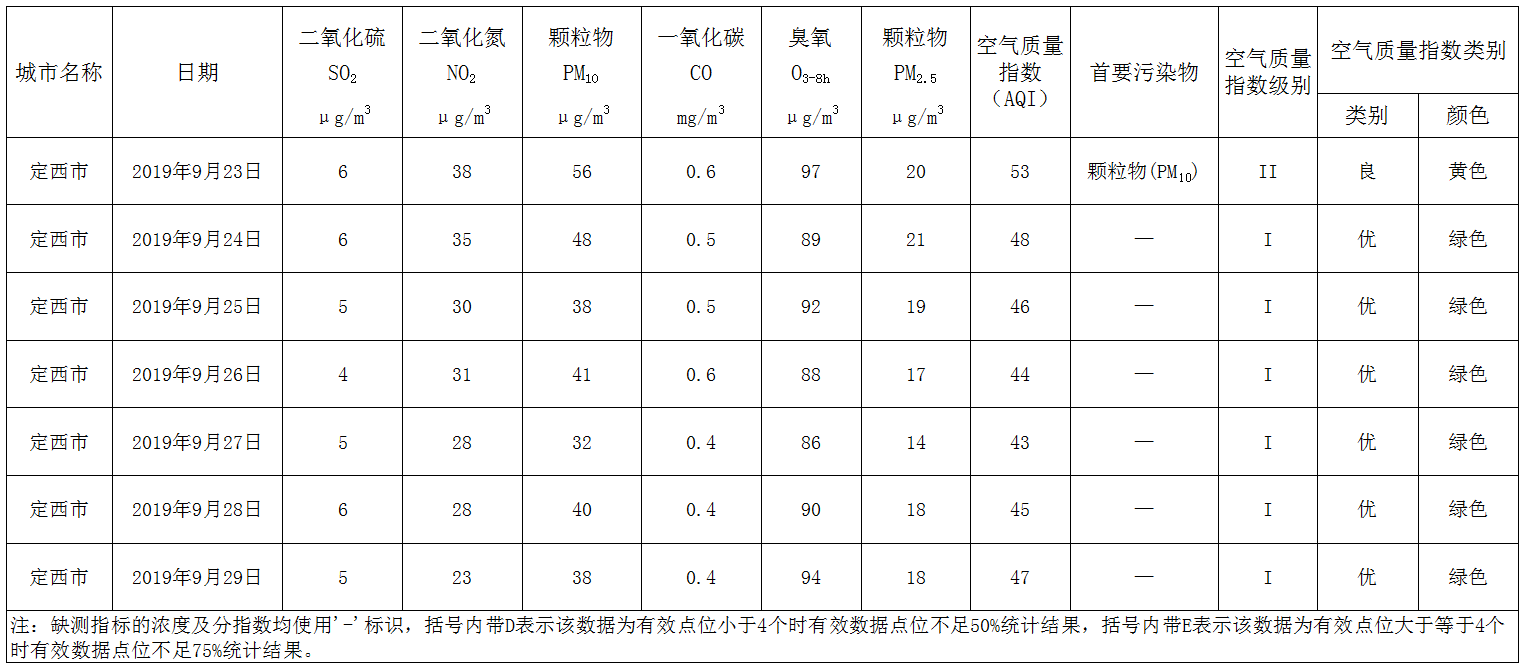 定西市区环境空气质量周报(2019年9月23日 - 2019年9月29日)