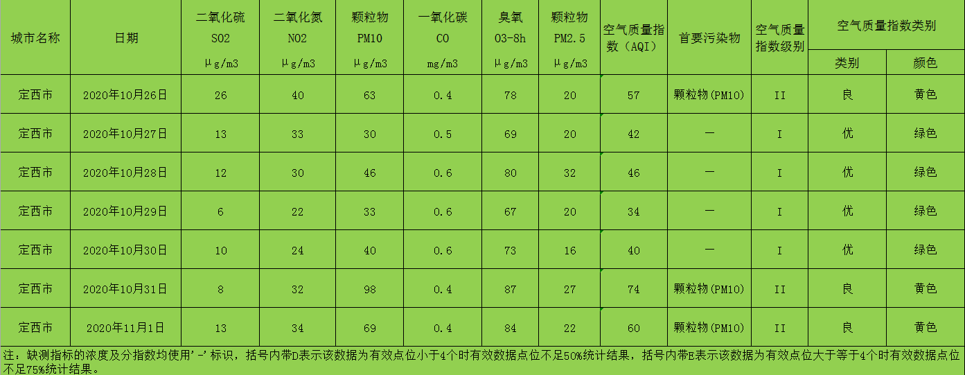 定西市区环境空气质量周报(2020年10月26日 - 2020年11月1日)
