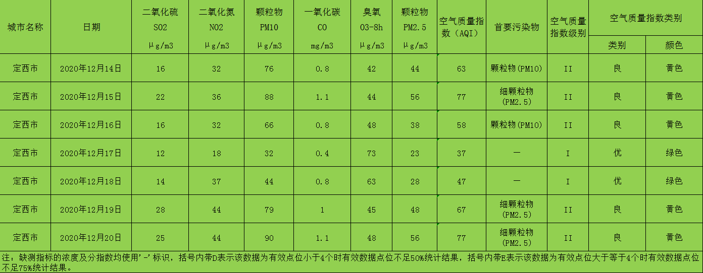 定西市区环境空气质量周报(2020年12月14日 - 2020年12月20日)
