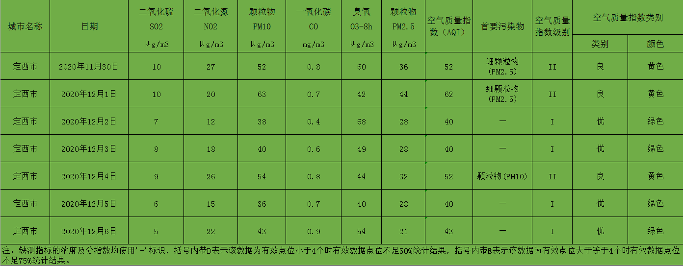 定西市区环境空气质量周报(2020年11月30日 - 2020年12月6日)