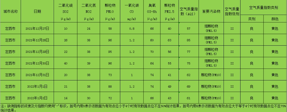定西市区环境空气质量周报(2021年12月27日 - 2022年1月2日)