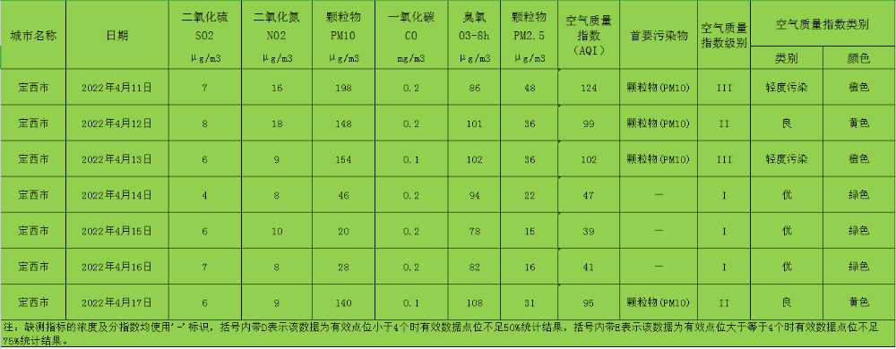 定西市区环境空气质量周报(2022年4月11日 - 2022年4月17日)