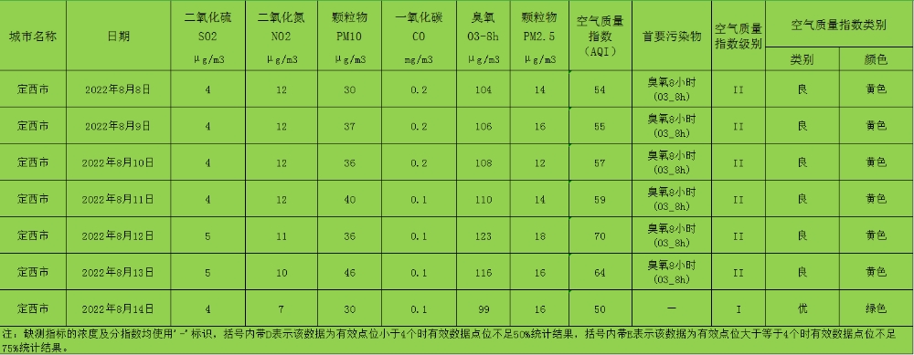 定西市区环境空气质量周报(2022年8月8日 - 2022年8月14日)