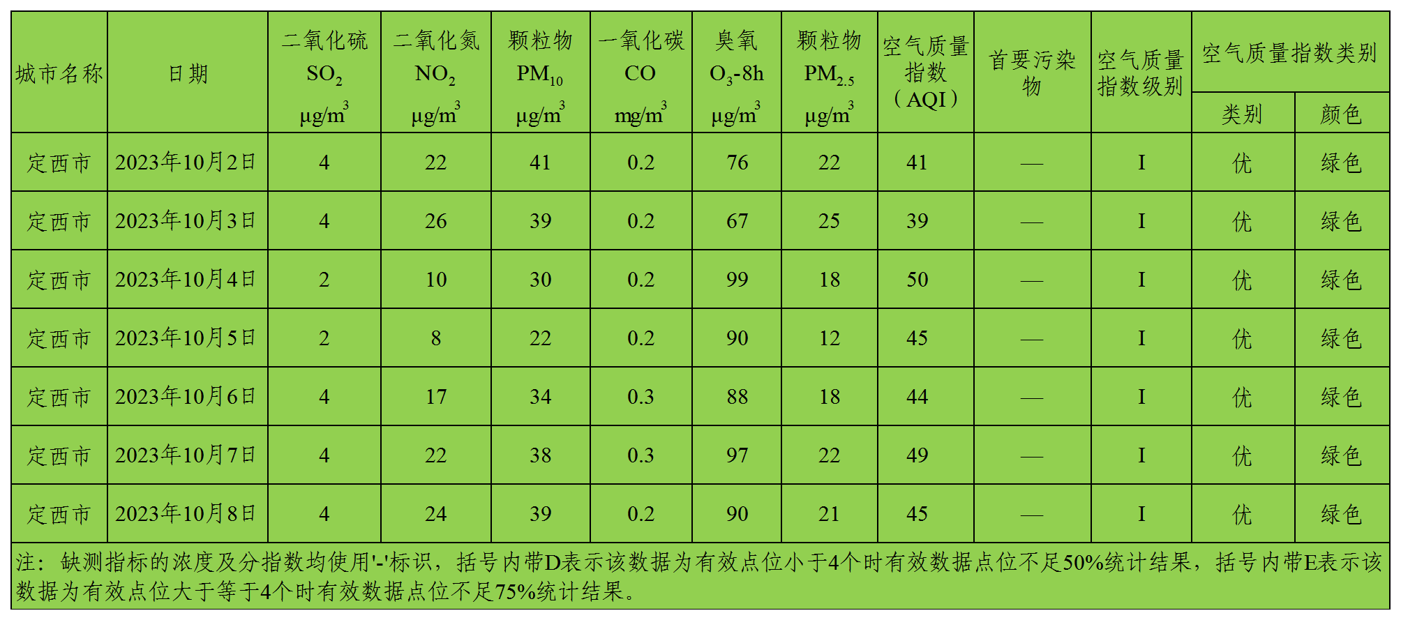 定西市区环境空气质量周报(2023年10月2日 - 2023年10月8日)