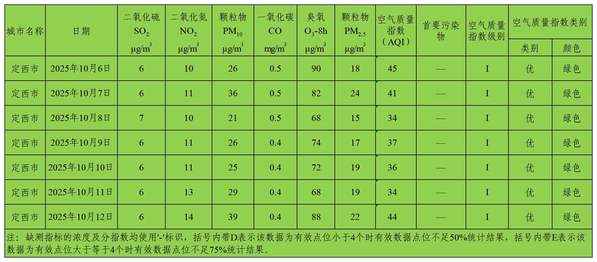 定西市区环境空气质量周报(2025年10月6日 - 2025年10月12日)