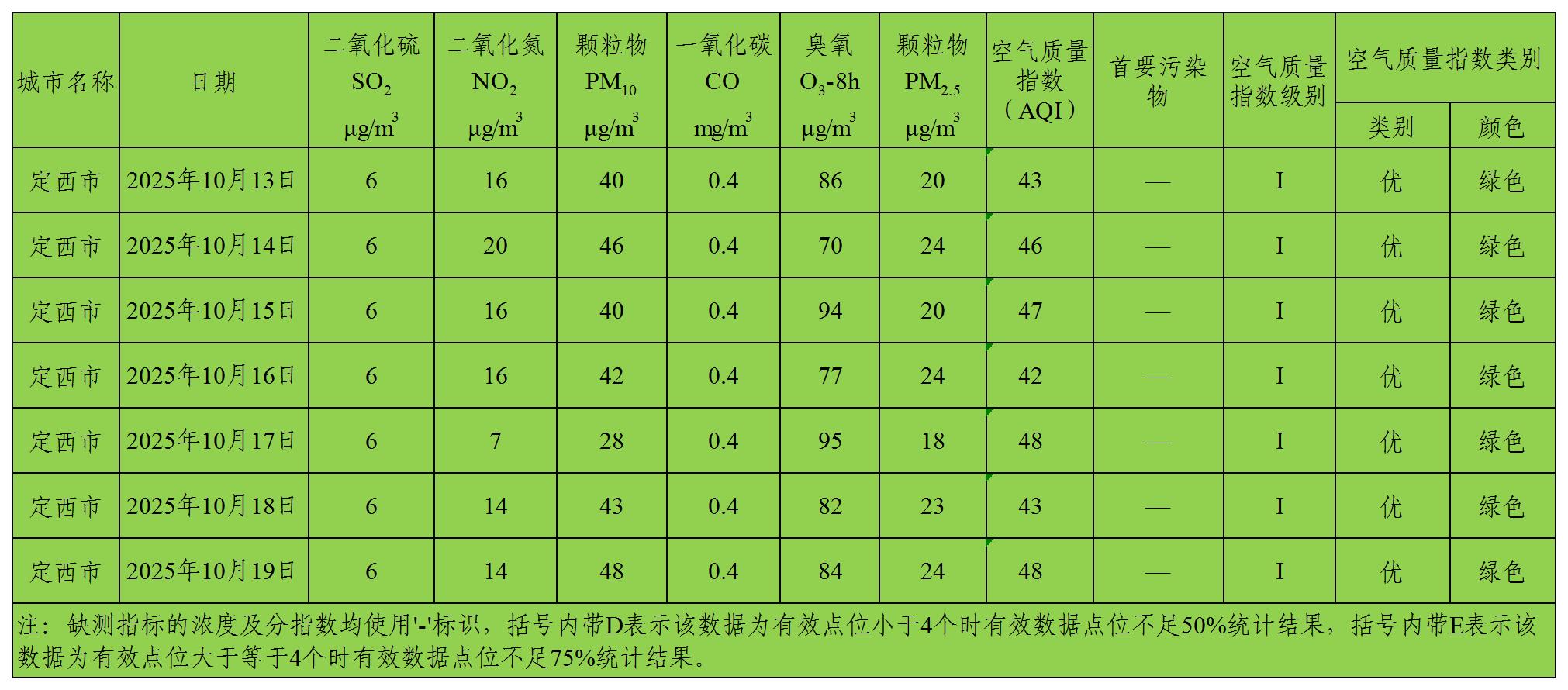 定西市区环境空气质量周报(2025年10月13日 - 2025年10月19日)