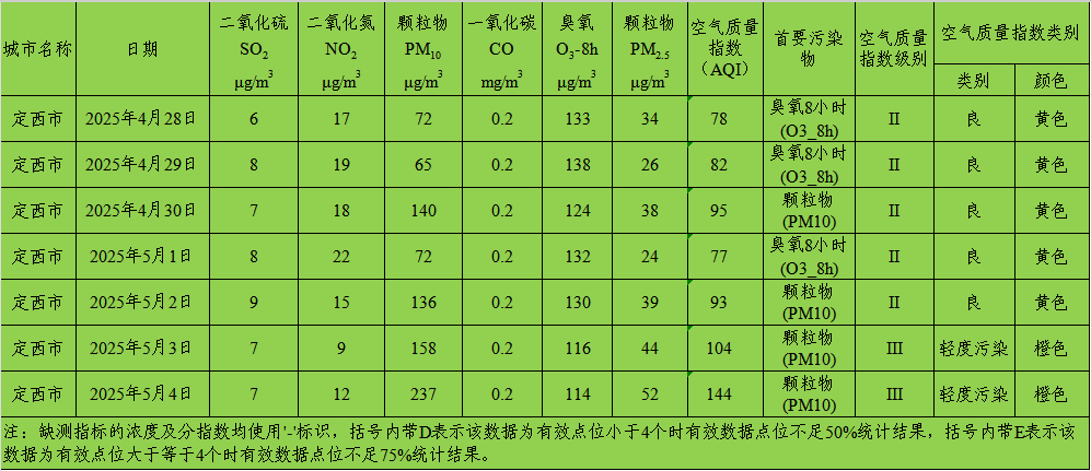定西市区环境空气质量周报(2025年4月28日 - 2025年5月4日)