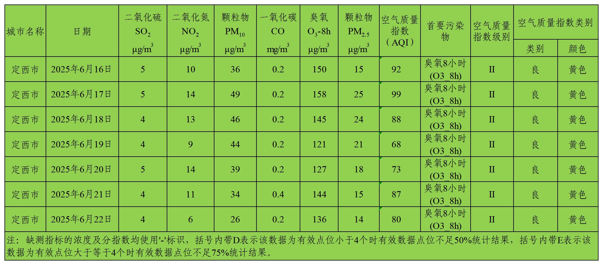 定西市区环境空气质量周报(2025年6月16日 - 2025年6月22日)