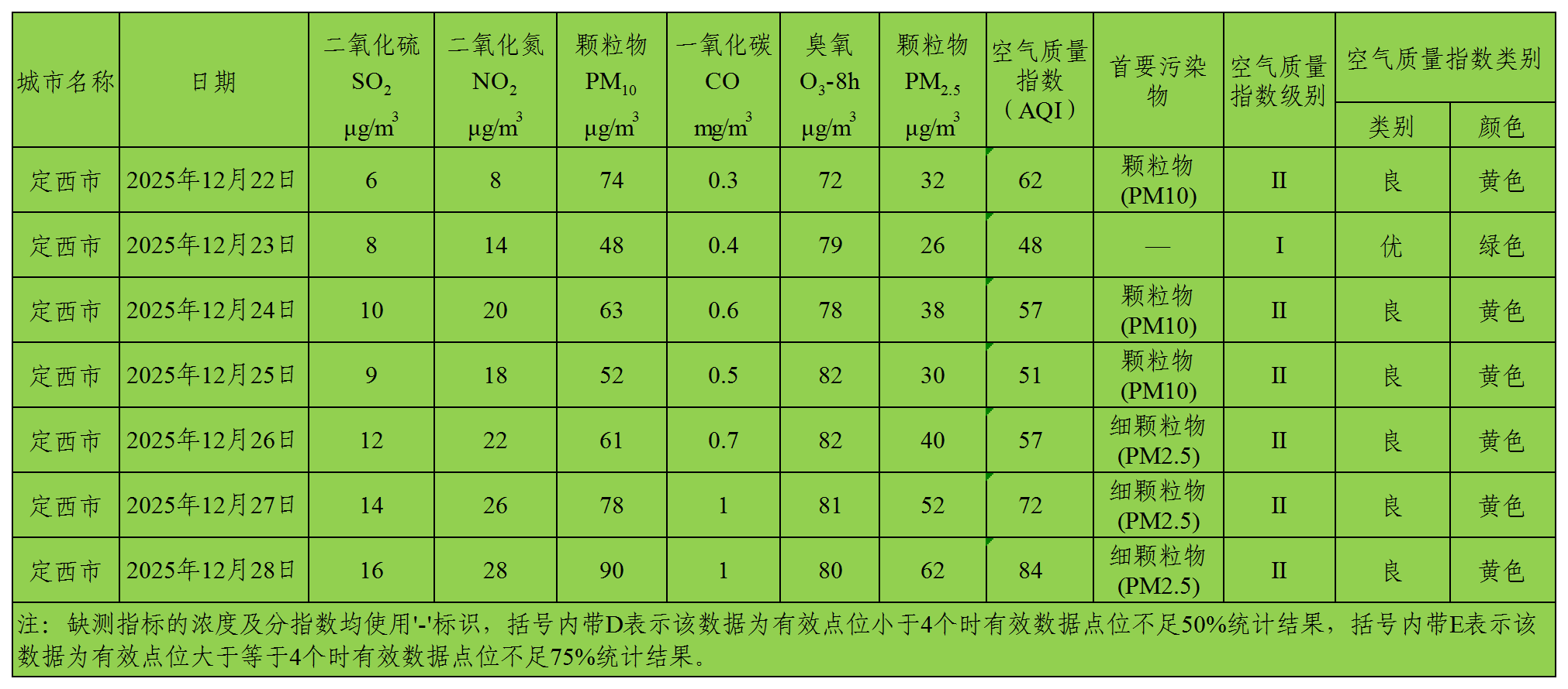 定西市区环境空气质量周报(2025年12月22日 - 2025年12月28日)