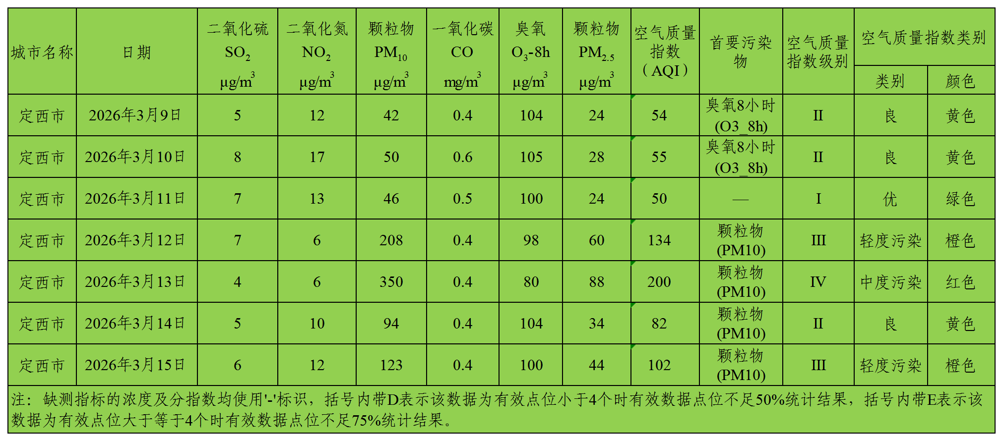 定西市区环境空气质量周报(2026年3月9日 - 2026年3月15日)