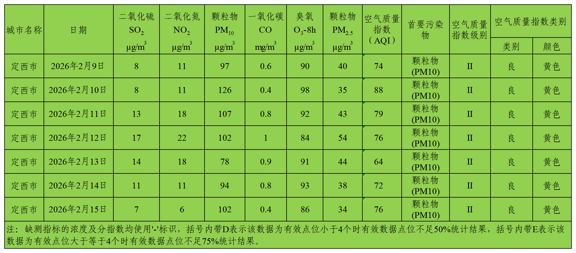 定西市区环境空气质量周报(2026年2月9日 - 2026年2月15日)